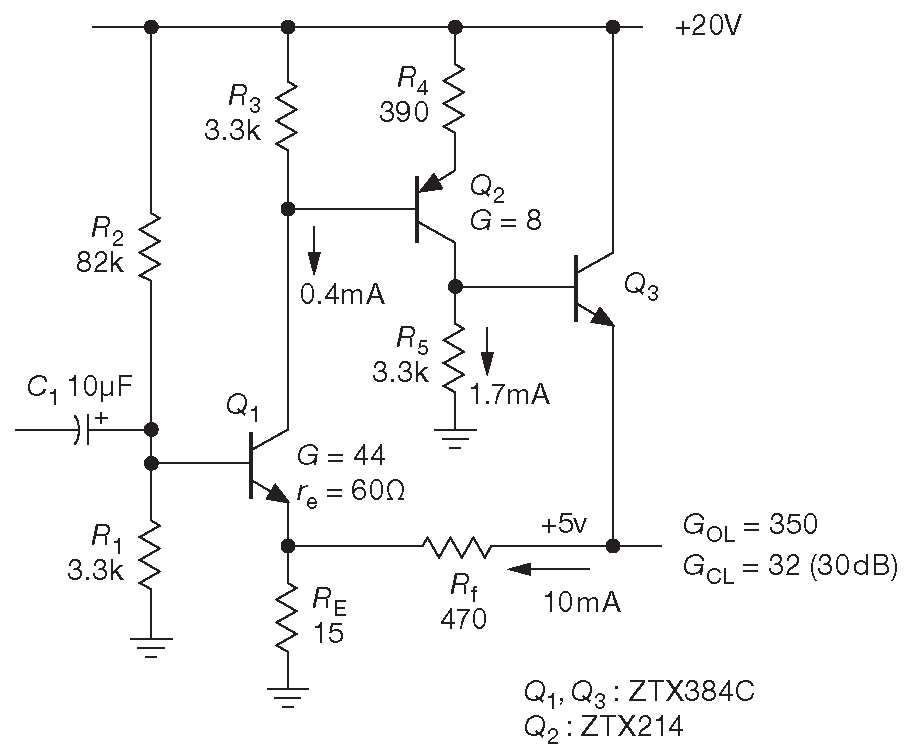 - вычисляем \(R_{load}=R_4·g_{m3}·R_3\) ≈ 1.3MΩ . Значит, усиление без обратной связи на низкой частоте находится в диапазоне 1000...3000 для токов коллектора \(Q_1\) 20...60 μA ( для напряжений на батарее 6...9V соответственно );