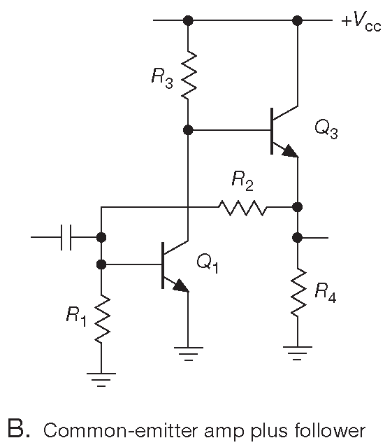 Схема требует инверсии сигнала обратной связи, поэтому начнём с каскада с общим эмиттером ( \(Q_1\) ) и эмиттерного повторителя ( \(Q_3\) ) , чтобы иметь выход с низким внутренним сопротивлением.