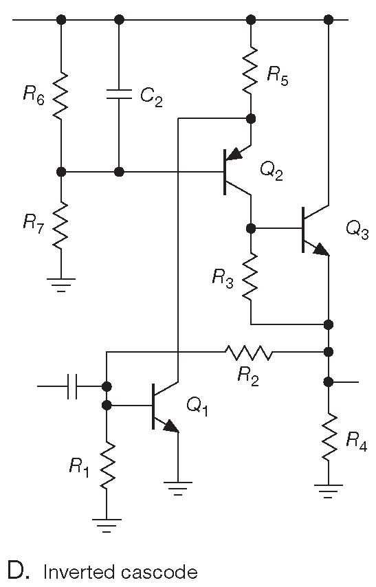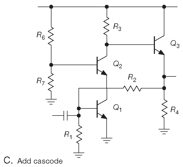 Устройство работает при низких токах ( 0.1 mA или около того ), и значит, имеет высокое внутреннее сопротивление, при котором эффект Миллера приводит к существенному сужению полосы пропускания. Неприятности купируются каскодом ( \(Q_2\) ) поверх входного транзистора ( \(Q_1\) ) .