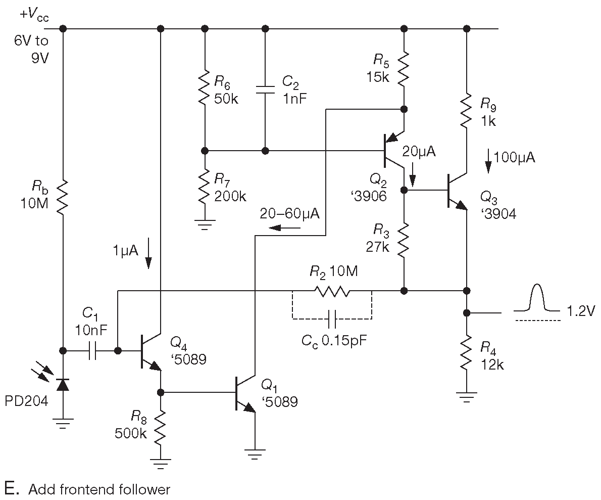 Полученное шумовое напряжение вместе со входной ёмкостью порядка 10 pF ( 5 pF даёт фотодиод, 2.5 pF - ёмкость перехода коллектор-база \( C_{cb}\) транзистора \(Q_4\) , и 2.5 pF - ёмкость монтажа ) создаёт на входе действующий шумовой ток ( §8.11.3 ) \(i_n=e_nωC_{in}\) = 90 fA/\(\sqrt{Hz}\) , если за характеристическую частоту \(ω\) взять 100 kHz .