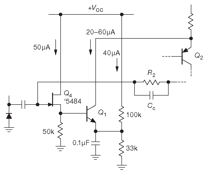 Эмиттерный повторитель \(Q_4\) работает при токе 1 μA , дробовый шум которого вызывает падение напряжения на внутреннем сопротивлении эмиттера \( r_e\) , равное \(e_n=r_e\sqrt{2qI_C}\) = 14.3 nV/\(\sqrt{Hz}\) . Внутреннее сопротивление базы \(Q_4\) составляет ∼300 Ω и добавляет незначительное напряжение теплового шума \(e_{n( J4 )}=\sqrt{4kTr_{bb'}}\) = 2.2 nV/\(\sqrt{Hz}\) . Суммарное напряжение \(e_{n(Q_4 )}\) = 14.5 nV/\(\sqrt{Hz}\) .
