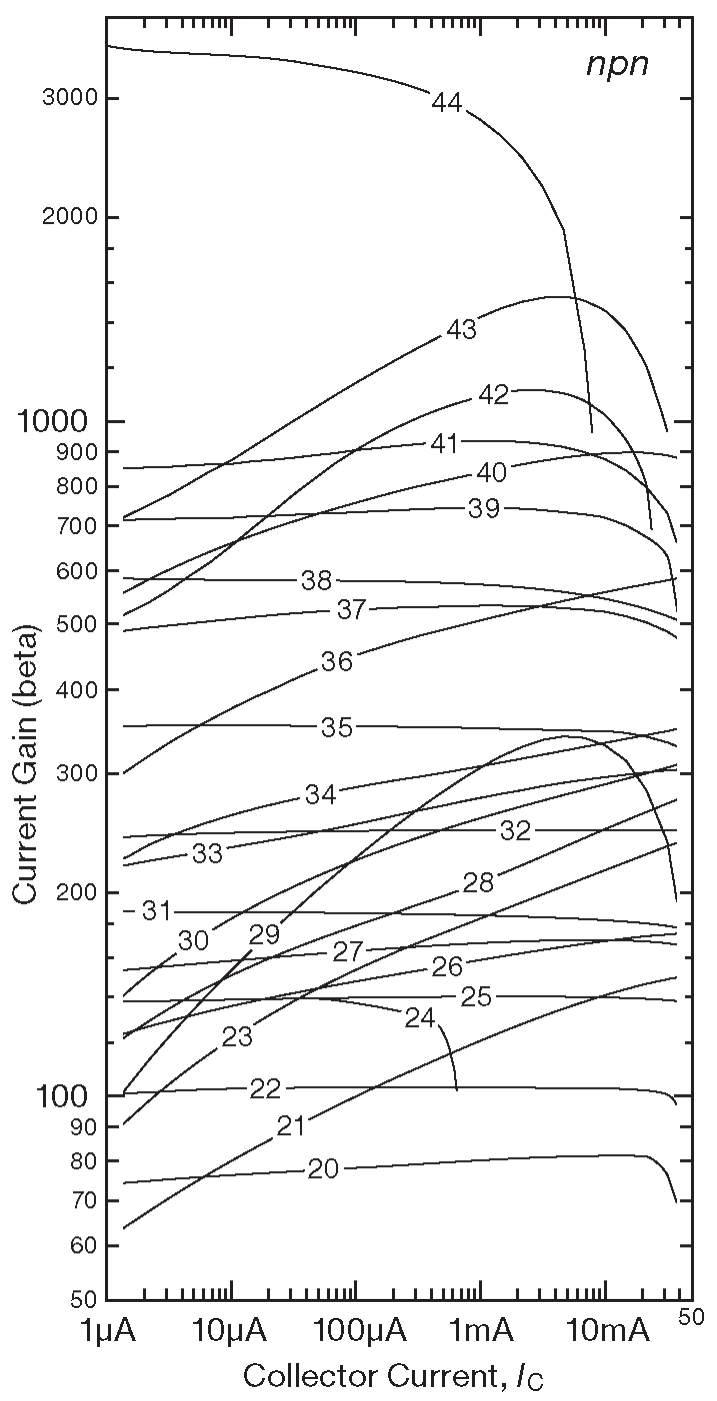 В общем случае коэффициент бета высоковольтных транзисторов ниже, чем у низковольтных. Пример: 300 V MPSA42 (#20 на графике ) имеет самое низкое усиление. В противоположность ему, транзистор с самой высокой бетой IT124 фирмы Linear Integrated Systems ( созданный на базе старых разработок фирмы Intersil) в качестве платы за сверхвысокое усиление имеет неприлично низкое \( V_{CEO} \) =2V (!). К счастью, они подправили техпроцесс и получили LS301 (#44 ), нормированный на 18 V и имеющий фантастическое усиление 3000 при токе 1 μA 44 .