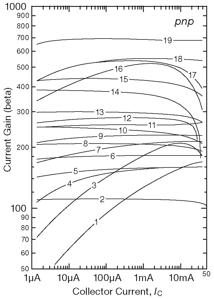 Некоторые из транзисторов после измерений параметров сортируются производителями по коэффициенту усиления. Например, BC850 с суффиксами «-A», «-B» и «-C» имеет при 2 mA усиление 180, 290 и 520 соответственно. Все стараются поставить в изделие компоненты с самым большим усилением, но их не всегда можно найти на складах. Кроме того, высокий коэффициент усиления имеет тенденцию к снижению со временем, у таких транзисторов ниже \( V_{CEO} \) и напряжение Эрли ( т.е. ниже выходной импеданс) 42 .