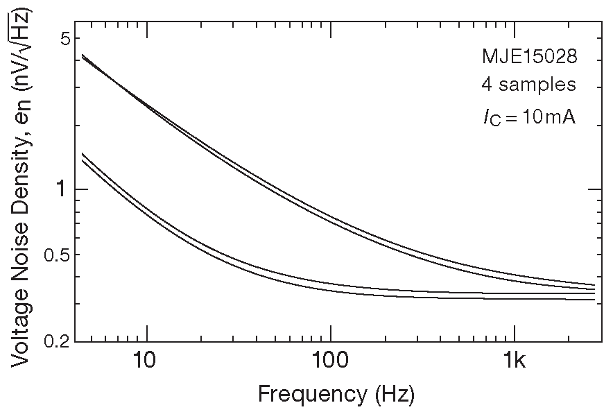 Рис.8.40 Восьмиамперные биполярные транзисторы семейства MJE15028-33 с очень низким значением внутреннего сопротивления базы \( r_{bb'}\) любимы фанатами звуковых усилителей. Звучит (!) хорошо, но по результатам измерений выяснилось, что параметры низкочастотного шума ( который не нормируется производителем ) даже в одной партии имеют разброс более 10 dB