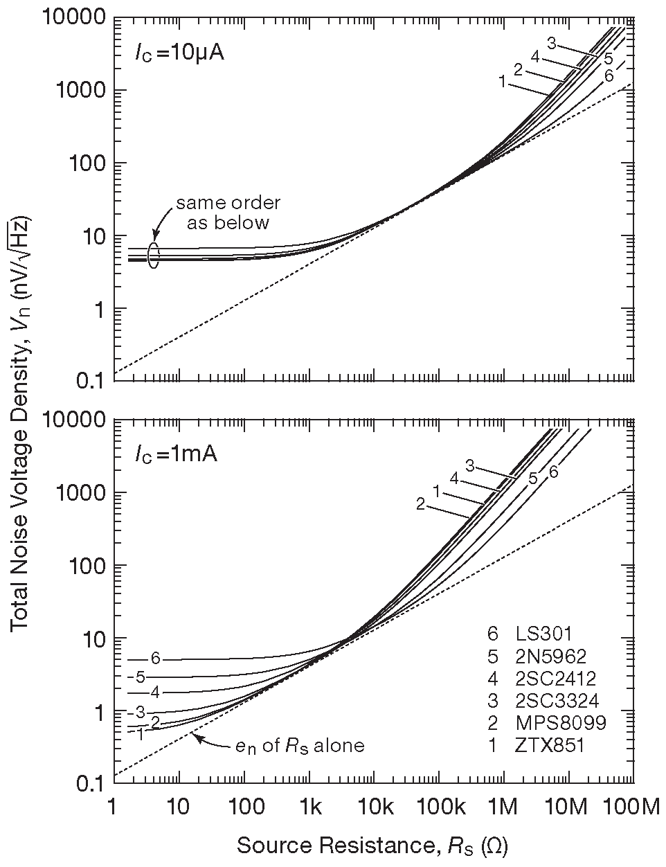 Указанные побочные эффекты рассматриваются в §8.5 [* интересно, а мы тут что читаем?] и показаны на рис. 8.32 , где приведён пример шумового сопротивления \(R_n=e_n/i_n\) . Стоит глянуть и на рис. 8.33 , где сравниваются транзистор с маленьким кристаллом и большим усилением 2N5962 и транзистор с большим кристаллом и малым \( r_{bb'}\) ZTX851 при токах коллектора от 1 μA до 10 mA 46 . ZTX851 превосходит 2N5962 для источников с \(R_S\) ниже 1 kΩ , при рабочем токе 100 μA и более. С другой стороны, 2N5962 выигрывает у ZTX851 на источниках с импедансом от 100 kΩ и выше при практически любых токах коллектора.