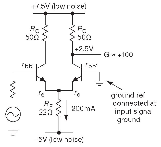 Оба решения в несколько упрощённом виде приведены на рис. 8.42 . Обе схемы обходятся без обратной связи. Это подразумевает, что предусилитель «класса-A» ( со средним коэффициентом усиления, ну, например, G=100 ) для микровольтовых сигналов линеен по умолчанию. Усилитель с общим эмиттером в однополярном включении проще и имеет 3dB запаса по уровню шума по сравнению с дифференциальной схемой. Но ему требуется БОЛЬШОЙ входной разделяющий конденсатор ( 150'000 μF , чтобы работать с очень низким импедансом источника на частотах в единицы Герц ), который тянет за собой большое время выхода на режим при включении и не эстетичен. Эта же схема используется для оценки скорости нарастания при отборе транзисторов в число малошумящих ( см. рис. 8.92 и сопутствующие рассуждения ), но в качестве предусилителя для ленточного микрофона будет взята связанная по постоянному току дифференциальная схема без обратной связи. Здесь нет входного конденсатора, размером со шкаф, правда, для работы с удвоенной мощностью шумов придётся снизить \( r_{bb'}\) и \( r_e\) в два раза ( т.е. придётся удвоить число параллельно включённых транзисторов в каждом из плеч дифференциальной пары ).
