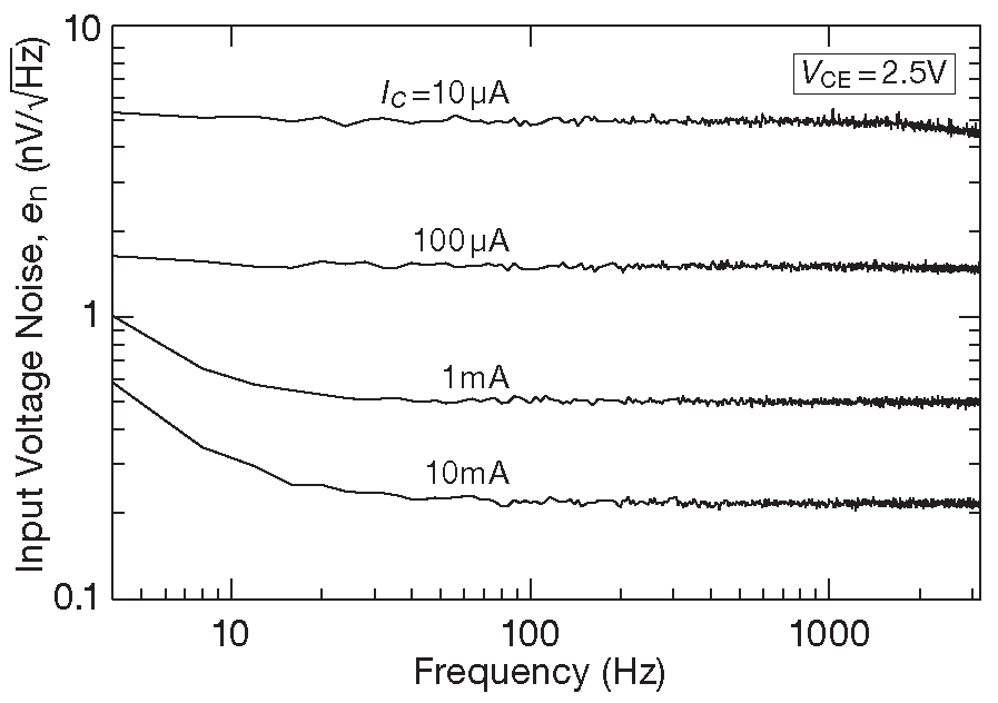 Для выявления величины \( r_{bb'}\) измерения шума проводились при достаточно высоком токе коллектора, чтобы подавить зависящий от него член уравнения \(e_n=\sqrt{4kT( r_{bb'} + 0.5 V_T/I_C )}\) ( см. рис. 8.10 ). Но пользователю обычно нужен более низкий рабочий ток. Например, уменьшение тока коллектора ZTX851 до 1 mA повышает напряжение шума почти в 2.3 раза ( до 0.48 nV/\(\sqrt{Hz}\) ), но зато уменьшение тока базы до 5 μA снижает шумовой ток в 3.2 раза до 1.2 pA/\(\sqrt{Hz}\) . На таких низких токах составляющая \(i_n·R_S\) на источнике 600 Ω сокращается до 0.72 nV/\(\sqrt{Hz}\) , а общий шум усилителя снижается до 0.86 nV/\(\sqrt{Hz}\) , что заметно ниже, чем 2.3 nV/\(\sqrt{Hz}\) при токе коллектора 10 mA , и гораздо ниже, чем тепловой шум резистора номиналом 600 Ω , равный 3.1 nV/\(\sqrt{Hz}\) . Иногда может даже возникнуть соблазн попробовать по-настоящему низкие токи, когда превалирует \( r_e\) ( равное \( V_T/I_C\) ) , а вклад от \( r_{bb'}\) незначителен.