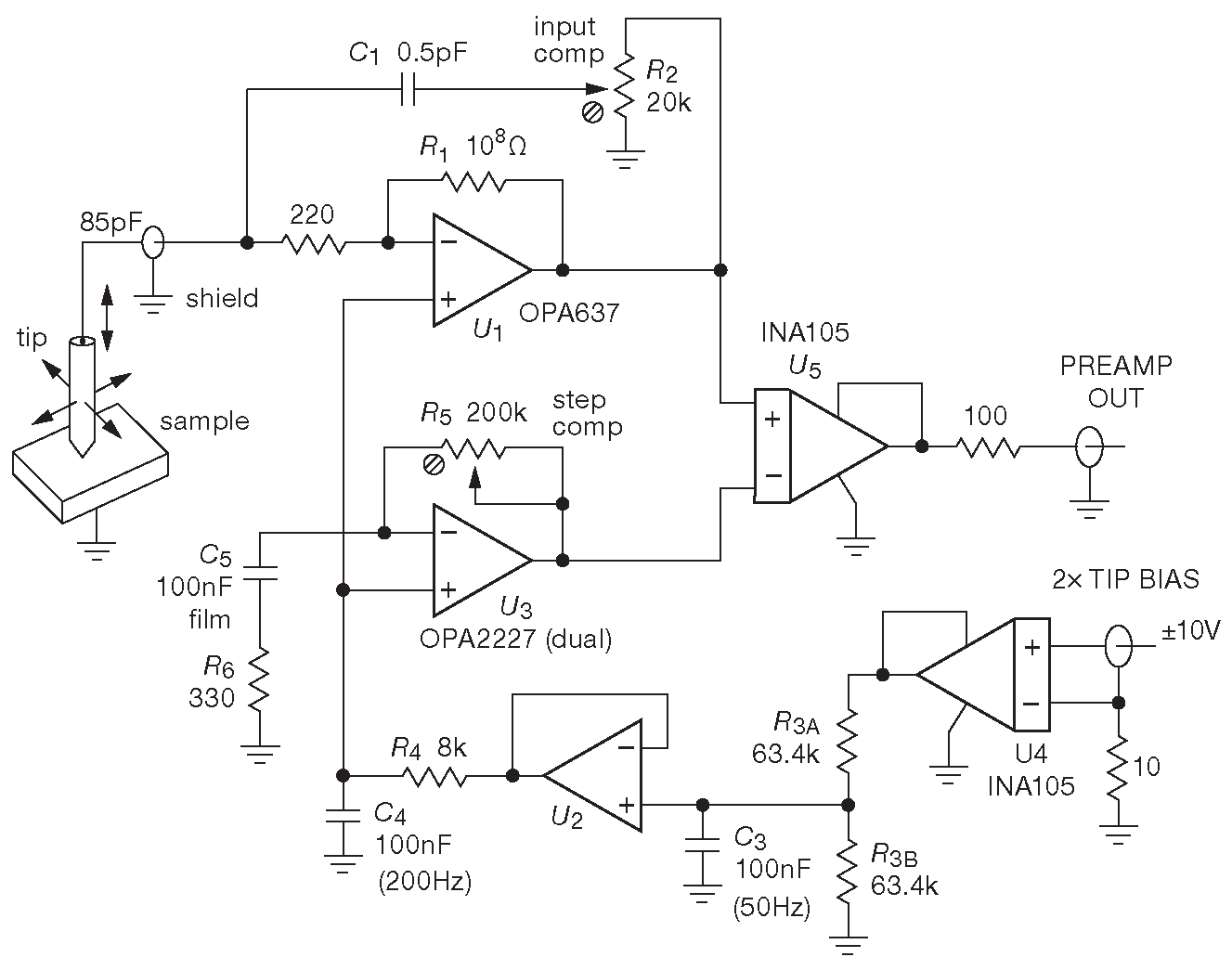 Предусилитель для STM - трансимпедансный усилитель - часто закрепляется на крышке вакуумной камеры, где на него через длинный экранированный провод приходит туннельный ток с измерительного электрода. Экран увеличивает ёмкость: обычное значение 50...200 pF . Электрод с предусилителем стоит в петле обратной связи управления расстоянием до образца и должен иметь достаточную рабочую полосу, например 20 kHz , чтобы увеличить скорость сканирования. Широкая рабочая полоса требует аккуратной настройки цепей обратной связи ( см. §X4.3 ), а от предусилителя требуется обеспечить рабочее напряжение на электроде.
