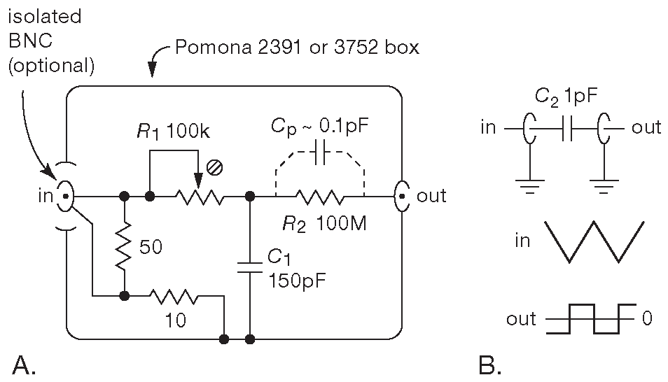 Рис.8.91 Тестовое оборудование, создающее прямоугольный токовый сигнал наноамперного диапазона, для калибровки трансимпедансных усилителей. (A) Подстраиваемая цепь \(R_1C_1\) ( «полюс» ), которая компенсирует выброс от паразитной ёмкости резистора \(R_2\) ( «нуль» ), позволяя входному сигналу размахом 0.1V прямоугольной формы создать в суммирующей точке чистый прямоугольный токовый сигнал амплитудой 1 nA . (B) Емкостной дифференциатор преобразует в суммирующей точке треугольный сигнал 500 mVpp@1 kHz в прямоугольные токовые импульсы ±1 nA