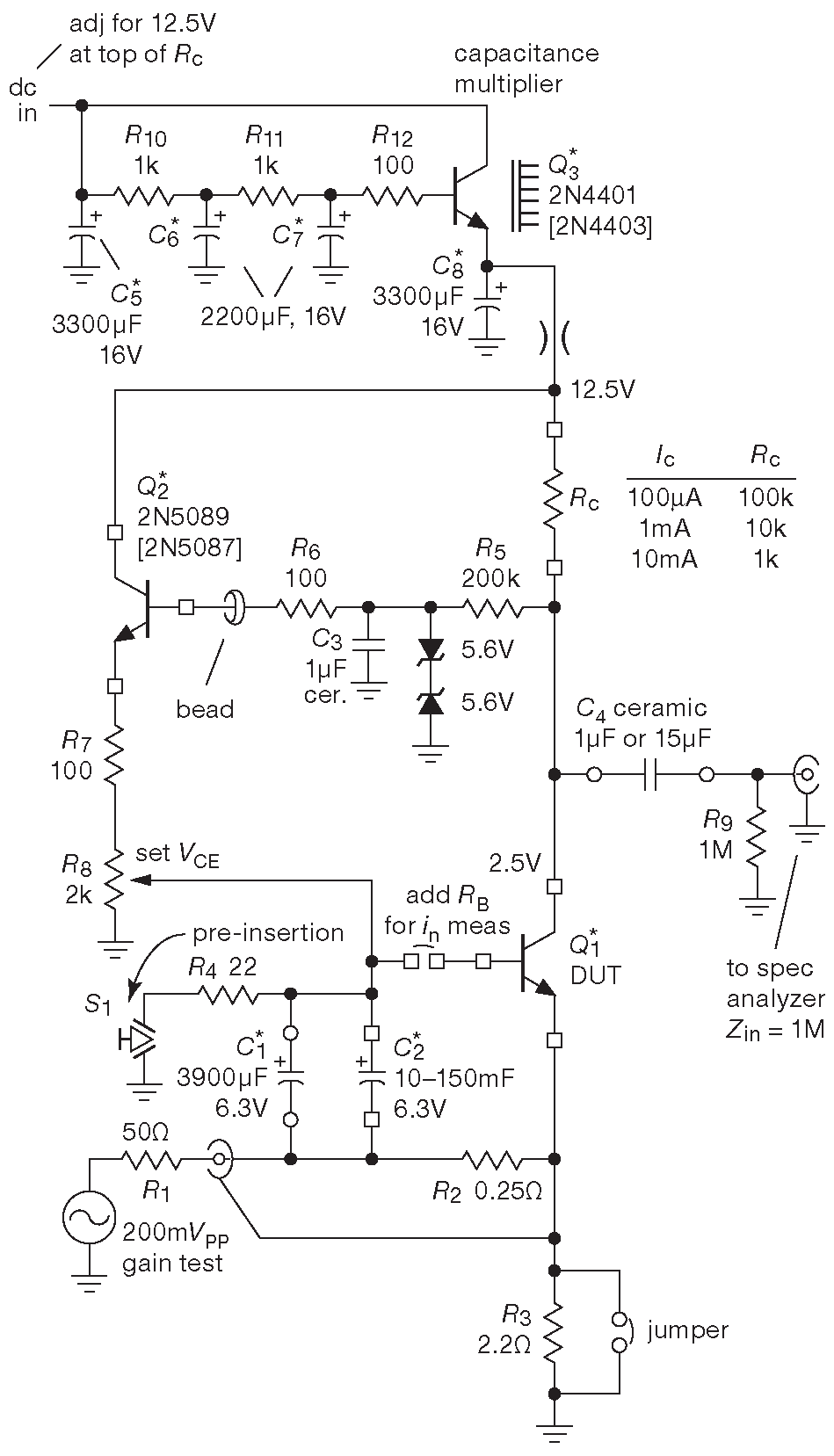 Рис.8.92 Схема для измерения шума транзисторов. \(Q_3\) вместе с обвязкой образует умножитель ёмкости, снижающий шум источника питания. На схеме показаны полярности элементов для измерения параметров npn транзистора ( DUT ); для pnp следует изменить полярности всех элементов, помеченных звёздочкой. Для измерения шумовых параметров тестовый сигнал для подстройки усиления заменяется перемычкой