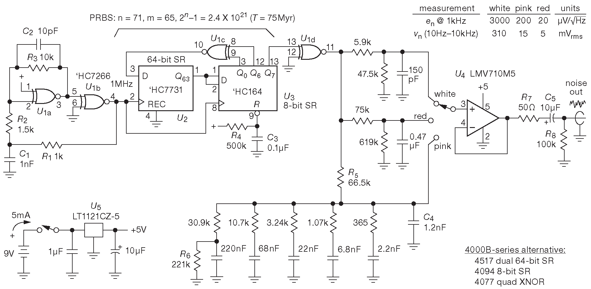 Интересный источник шума можно сделать, используя цифровую технику, а именно, подключив на входе длинного сдвигового регистра схему суммирования «по-модулю-2» нескольких бит того же регистра ( см. §11.3.1 и §13.14 ). В итоге на выходе образуется псевдослучайная последовательность нулей и единиц, из которой после аналоговой фильтрации можно получить белый шум. Хороший шумовой спектр можно получить, если частота среза ФНЧ будет лежать сильно ниже частоты сдвига регистра. Такие штуки могут тарахтеть на очень высоких частотах, формируя сигнал в полосе сотен мегагерц. У создаваемого «шума» есть одно интересное свойство: цифровая последовательность повторяется с периодом, зависящим от длины сдвигового регистра (n-разрядный регистр максимальной длины имеет 2n–1 уникальных состояний ). Без каких-либо сложностей можно увеличить период повторения до десятков лет и более, хотя для большинства применений нескольких секунд хватит за глаза. Например, 50-разрядный регистр, сдвигаемый с частотой 10 MHz , будет создавать белый шум с полосой до 1 MHz и периодом повторения 3.6 лет.