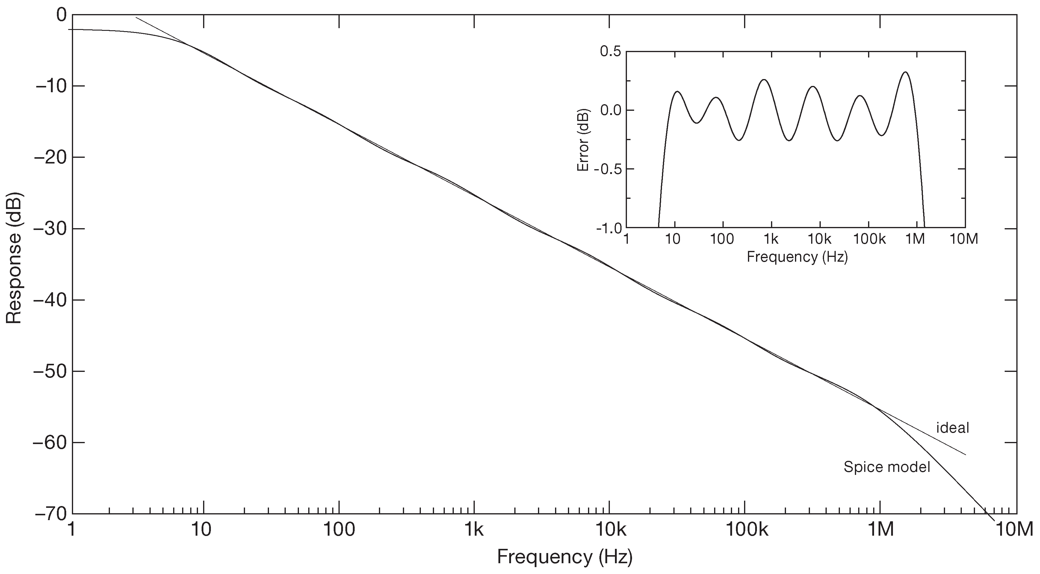 С розовым шумом задача чуть хитрее: требуется ослаблять амплитуду белого шума с коэффициентом 1/\(\sqrt{2}\) ( а не 1/2 как у красного ) при каждом удвоении частоты. Обычный аналоговый подход состоит в прогоне сигнала через параллельно включённые последовательные RC секции ( см. рис. 8.93 ). Характеристическая частота каждой следующей секции увеличивается в некоторое заданное число раз ( в схеме - 10× , т.е. на одну декаду ), а импеданс снижается в квадратный корень из того же числа ( здесь - \(\sqrt{10}\) ) . Даже с таким широким шагом частоты результат весьма неплох, как можно судить по результатам симуляции в SPICE ( рис. 8.94 ): отклонение от идеальной характеристики не превышает ±0.25 dB в полосе частот шириной пять декад - от 10 Hz до 1 MHz 122 .