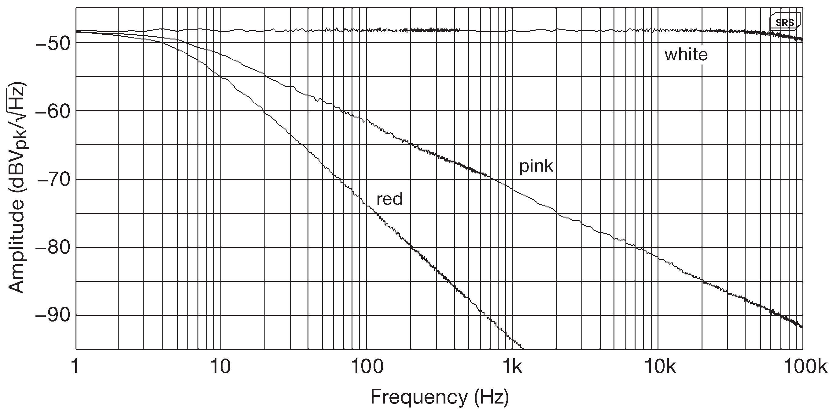 Некоторые универсальные источники шума могут создавать вдобавок к белому розовый шум. Такой шум имеет равную шумовую мощность в пересчёте на октаву, а не на герц, как белый. Плотность ( мощность на герц ) розового шума спадает со скоростью 3 dB/octave ( поэтому на слух он выглядит более ровным, нежели белый ) и часто используется для проверки звуковых систем. Обычной задачей является выравнивание АЧХ звуковых колонок, на которые подаётся сигнал с источника розового шума, а измерение проводится с помощью ручного анализатора спектра ( типа программного приложения «Smaart» ). RC фильтр имеет наклон характеристики 6 dB/octave , поэтому для превращения белого шума в розовый требуется более сложная схема. В следующем параграфе рассказывается, как это сделать.