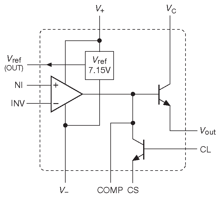 Схема µA723 - классика построения стабилизаторов. Она разработана Бобом Видларом и впервые представлена публике в 1967 году. Это универсальный регулятор с отличными параметрами _6 , который легко использовать. Хотя сейчас его не стоит ставить в новую разработку, познакомиться с устройством будет полезно, потому что современные модели работают по тем же принципам. Блок-схема представлена на рис. 9.3 . Это на самом деле «набор для построения источников питания». Кристалл содержит термокомпенсированный источник опорного напряжения ( 7.15 V±5% ), дифференциальный усилитель, проходной транзистор и схему ограничения тока. В том виде, в котором он поставляется, 723 не может ничего стабилизировать: ему нужны внешние компоненты.