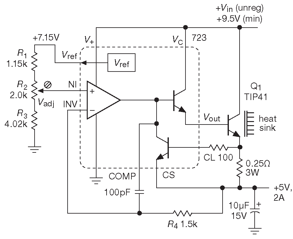 Для снятия ограничения на ток нагрузки в схеме стоит внешний проходной транзистор, образующий в паре с внутренним транзистором 723 схему Дарлингтона. Внешний транзистор нужен также для удержания рассеиваемой мощности микросхемы в оговоренных пределах: 1W при 25°C . При более высоких температурах допустимая мощность снижается: для 723 требуется обеспечить снижение этого параметра в пропорции 8.3 mW/°C при температуре, превышающей 25°C , чтобы не допускать перегрева кристалла. Таким образом, стабилизатор на +5V , имеющий +15 V на входе не может дать в нагрузку более 80 mA . Внешний транзистор \(Q_1\) может рассеивать 14 W при входном напряжении \( V_{in}\) =12 V и токе нагрузки 2A . Такая мощность требует теплоотвода - ребристой металлической пластины, передающей тепло наружу. Иногда в качестве теплоотвода используется металлический корпус блока питания, на который непосредственно монтируется мощный транзистор. Подробнее тема избыточного тепла раскрывается чуть дальше _8 . Потенциометр используется для точной подстройки напряжения +5V . Он должен перекрывать разброс номиналов резисторов и возможную разницу величины \( V_{REF}\) . В данном случае диапазон подстройки составляет ±1V от номинала. Это пример разработки схемы с учётом наихудшего сочетания параметров. Отметим, что для работы схемы ограничения тока требуется шунт в виде мощного низкоомного резистора.