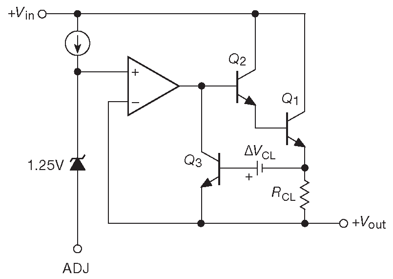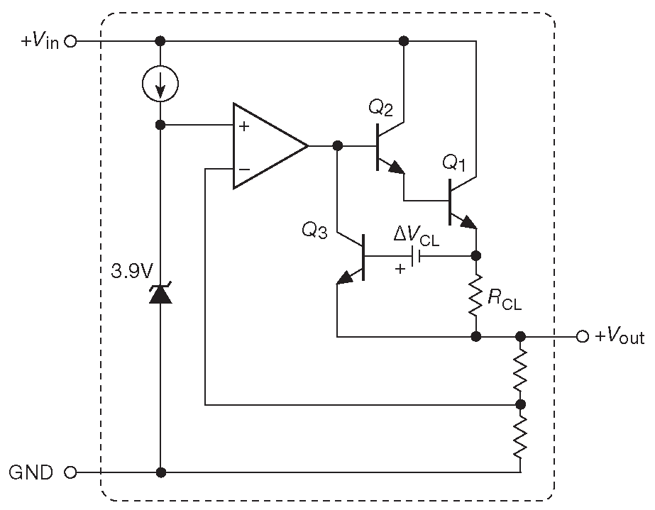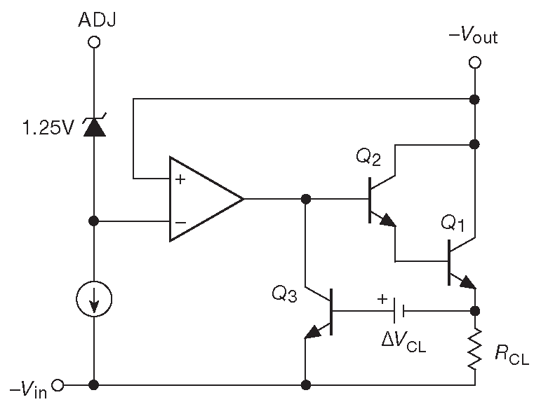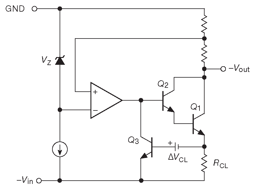 Рис. 9.6 Упрощённая схема 3-выводного стабилизатора на фиксированное напряжение 78xx. Все компоненты находятся внутри корпуса, поэтому микросхеме требутся только пара фильтрующих конденсаторов на входе и выходе, см. рис. 9.8 . Токовый шунт \(R_{CL}\) имеет номинал около 0.2 Ω и собран так, чтобы падение на нём на максимальном токе было чуть меньше падения на диоде. Напряжение на шунте в паре с внутренним источником \(Δ V_{CL}\) включает токоограничительный транзистор \(Q_3\)