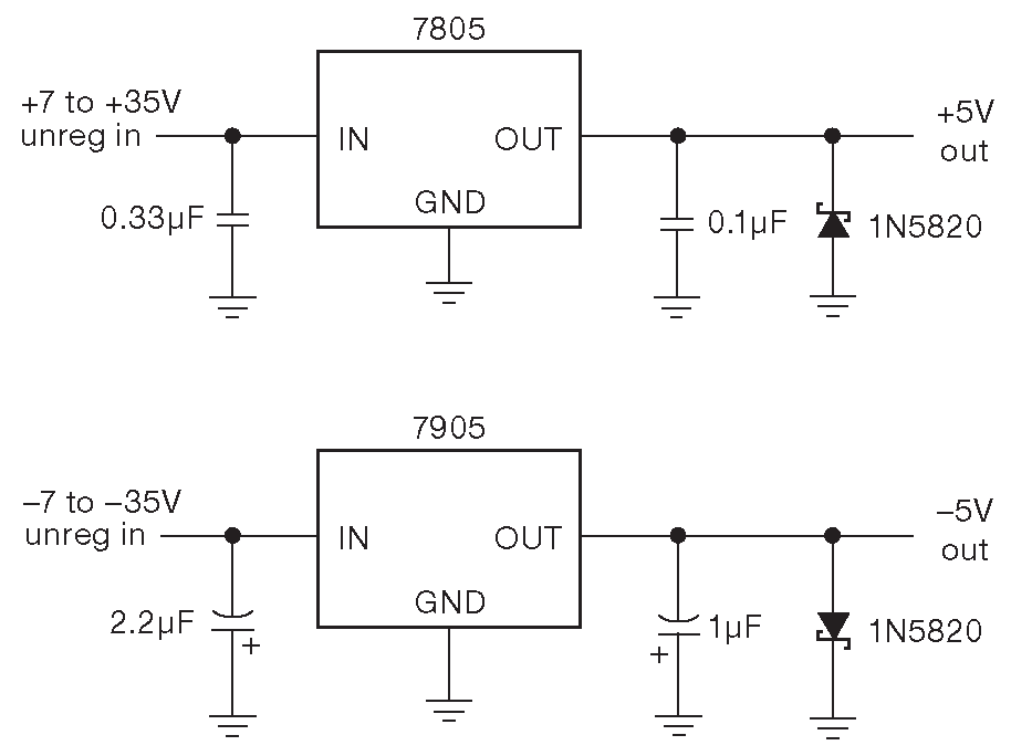 На рис. 9.8 показано, насколько легко сделать источник на +5V с помощью такой микросхемы. На рисунке есть и вариант на –5V на 7905. Проходные конденсаторы на выходе нужны для устойчивости. Кроме того, они улучшают переходную характеристику и обеспечивают низкий выходной импеданс на высоких частотах, где усиление в петле обратной связи самого стабилизатора снижается 12 . Конденсатор на входе нужен для всё той же устойчивости. Показанные на схеме номиналы являются минимальными значениями, оговоренными в справочных данных, но если сам стабилизатор стоит рядом с источником нерегулируемого напряжения или нагрузкой, то соответствующий конденсатор можно опустить.