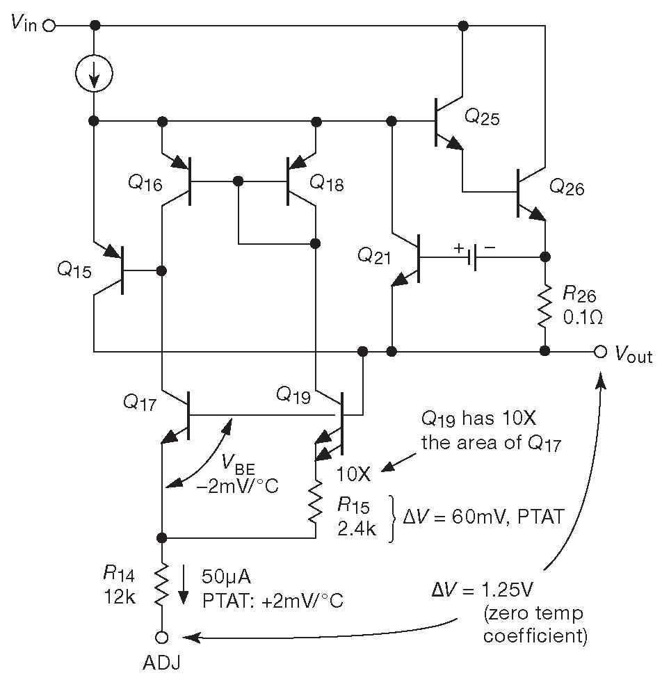 Рис. 9.13 Упрощённая схема линейного стабилизатора LM317, из которой понятно, как работает внутренний термокомпенсированный источник опорного напряжения