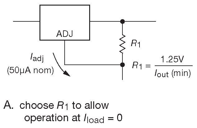 Рис. 9.14 (A) Примеры использования LM317. Выбор \(R_1\) для работы без нагрузки