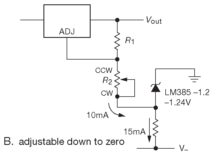Схема на стандартном 317 ( например, рис. 9.10 ) имеет нижний предел регулировки выхода на уровне \( V_{REF}\) . Ноль на выходе можно получить, если опустить нижний вывод \(R_2\) в отрицательную область. Требуется только обеспечить достаточно тока, чтобы перевести в рабочий режим внешний опорный источник.