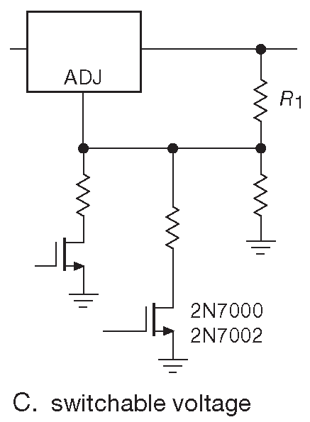 Рис. 9.14 (C) Примеры использования LM317. Выбор нескольких фиксированных выходных уровней