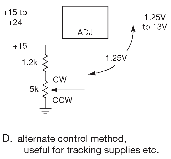 Рис. 9.14 (D) Примеры использования LM317. Ещё один способ регулирования выходного напряжения, лучше подходящий для блоков питания