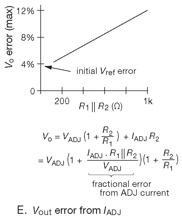 Рис. 9.14 (E) Примеры использования LM317. Ошибка от тока \(I_{ADJ}\)