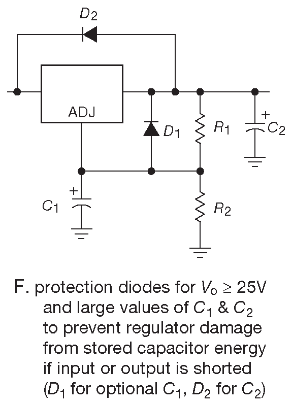 Рис. 9.14 (F) Примеры использования LM317. Защита от обратных разрядных токов \( C_1 \) и \( C_2\) при закорачивании выхода ( \( D_1\) ) или входа ( \( D_2\) )