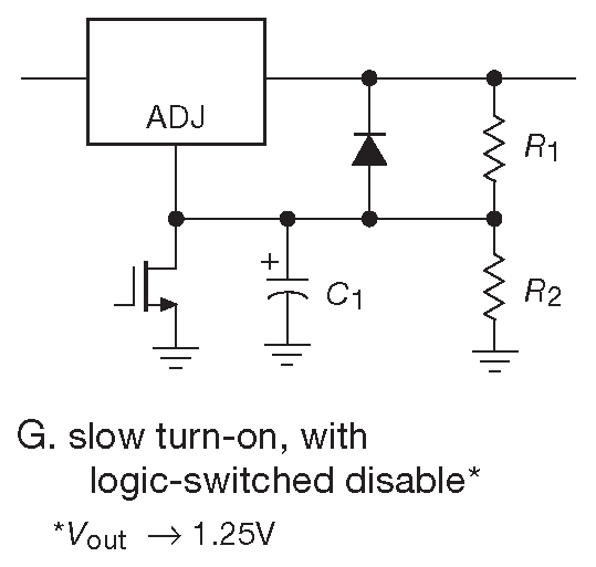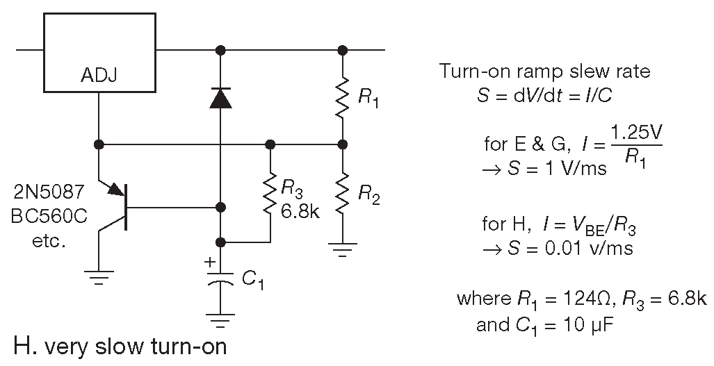 Можно увеличить время выхода на рабочий режим, повесив на вывод «ADJ» конденсатор большого номинала ( здесь потребуется защитный диод, см. §9.3.4.F ) 18 . В обоих вариантах схемы конденсатор заряжается постоянным током, вызывая плавный подъём выходного напряжения. Из-за небольшого сопротивления \(R_1\) ёмкость конденсатора становится весьма заметной ( для времени нарастания 10 ms/V и \(R_1\) =125 Ω потребуется конденсатор 100 μF ). Ситуация исправляется повторителем ( рис. 9.14H ). Отметим, что выходное напряжение начинает плавный рост не с нуля, сначала оно скачком увеличивается до \( V_{REF}\) =1.25 V для схемы 9.14G или до \( V_{REF}+V_{BE}\) ≈1.8 V для 9.14H , а потом начинает плавный рост. По тем же причинам ключ «DISABLE» ( рис. 9.14G ) понижает выходное напряжение не до нуля, а до \( V_{REF}\) .