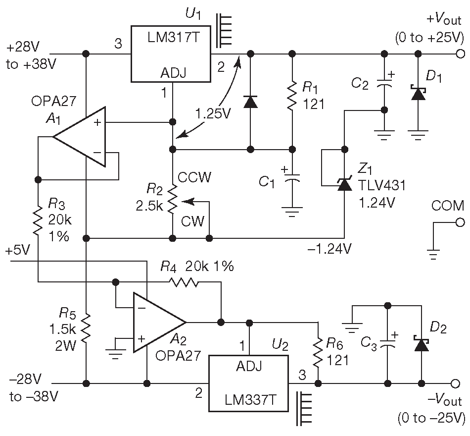 Источник двуполяного напряжения с симметричными выходными уровнями на напряжение от 0 до ±25 V и током до 0.5 A - штука очень полезная. Его можно купить за несколько сотен долларов или около того, а можно собрать самостоятельно на паре 3-выводных регулируемых регуляторов. Схема показана на рис. 9.15 . В положительном плече стоит LM317 в корпусе TO-220 ( суффикс «-T» ). С правильно подобранным радиатором ( \(R_{\Theta JC}\) ≈ 2°C/W см. §9.4 ). Регулировка напряжения до 0V выполнена по схеме 9.14B - нижний конец делителя для 317 подключён к потенциалу –1.24 V . Для точной симметрии напряжение с вывода «ADJ» \(U_1\) инвертируется и подаётся на стабилизатор отрицательного напряжения LM337.
