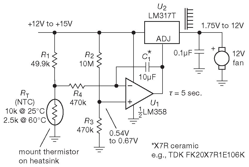 Рис. 9.16 Управление скоростью вентилятора с помощью схемы с обратной связью на термисторе. Аналоговое управление позволяет избавиться от шумов переключения, а переменная скорость минимизирует акустический шум