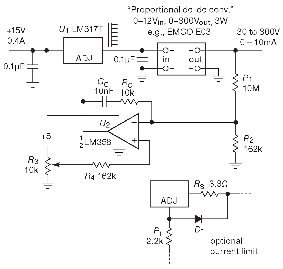 Более дешёвым решением будет использование модуля чистого преобразования без встроенного стабилизатора. В таких устройствах выходное напряжение - это масштабная копия питающего и меняется вместе с ним, отчего они часто называются «пропорциональными» DC-DC преобразователями. Типовой представитель имеет вход 0...12 V , а на выходе в зависимости от модели может давать от 100 V до 25 kV при мощности от долей ватта до 10 W или около того. Рис. 9.18 показывает возможное включение 3-ваттного модуля пропорционального преобразователя EMCO. Выходное напряжение устанавливается с помощью \(R_3\) , причём минимальное выходное напряжение определяется уровнем 1.25 V на выходе LM317. Вариант с ограничением тока защищает преобразователь при перегрузках 19 . Общая розничная цена компонентов без преобразователя укладывается в $0.75: данная схема - чемпион дешевизны.