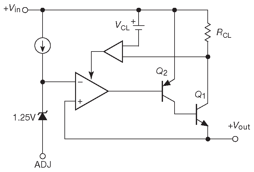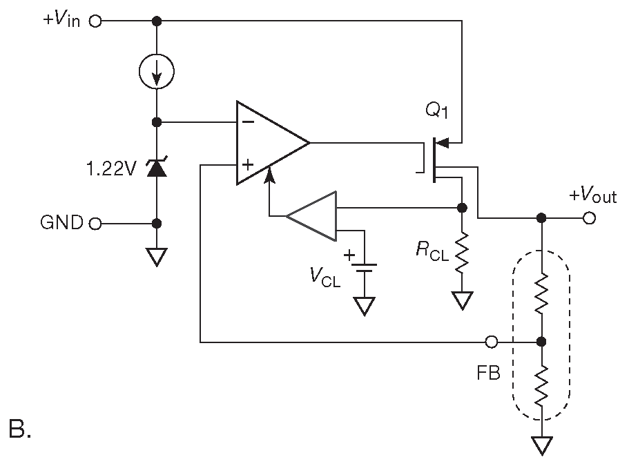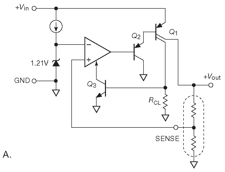 Падение на регулирующем элементе можно снизить ещё сильней, если заменить в выходном каскаде npn транзистор ( повторитель ) на pnp ( усилитель с общим эмиттером ), см. рис. 9.20 A . Такая конфигурация избавляет от одного потенциала \( V_{BE}\) , а общее падение начинает определяться напряжением насыщения транзистора. Чтобы удержать общее падение на возможно более низком уровне из схемы ограничения тока выбрасывается последовательно включённый шунт. Вместо него используется тестовый ток, состоящий с током нагрузки в некоторой пропорции и снимаемый со второго коллектора \(Q_1\) . Это менее точный, но достаточный для поставленной задачи способ, который позволяет избежать разрушительных токов. Например, справочные данные на LT1764A указывают минимальный уровень ограничения 3.1 A , а типовое значение 4A 20 .