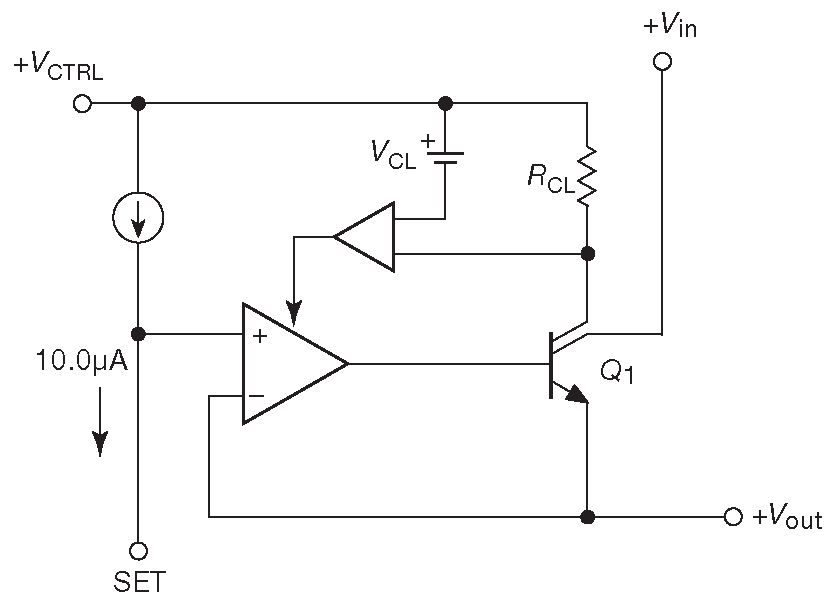 Взглянем ещё раз на схему типового линейного регулятора на рис. 9.6 и 9.9 . Падение порядка 2V возникает из-за двух последовательных перепадов \( V_{BE}\) в выходном повторителе, построенном по схеме Дарлингтона, и напряжении на токовом шунте защитной цепи ( ещё одно падение \( V_{BE}\) в режиме ограничения ). Разрешить проблему можно, изменив схему выходного каскада ( взяв схему Шиклай в качестве замены для каскада Дарлингтона §2.4.2.A ) и применив иную цепь ограничения тока.