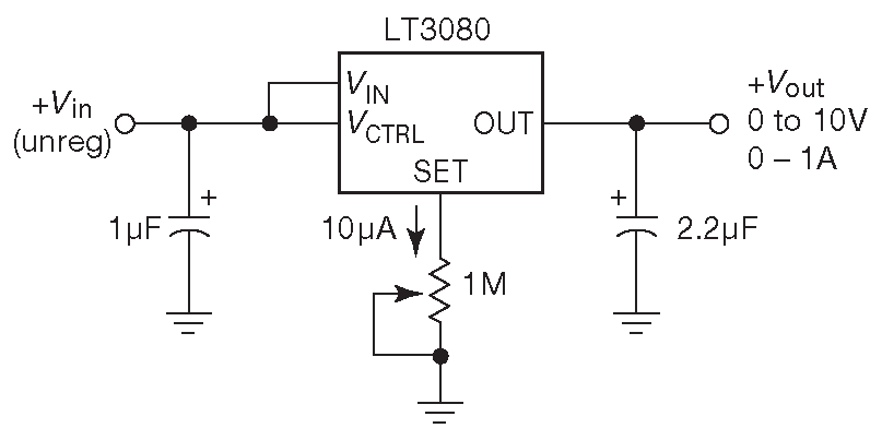 Очень хорошей альтернативой традиционному подходу является LT3080, созданный фирмой Linear Technology ( рис. 9.21 ). Это 3-выводной регулируемый стабилизатор положительного напряжения ( в некоторых видах корпусов есть и четвёртая ножка ). Вывод «ADJ», который здесь зовётся «SET» выдаёт точный ток ( \(I_{SET}\) =10 μA±2% ), а усилитель ошибки заставляет выход повторять напряжение на «SET». Т.е. если поставить между выводом «SET» и землёй резистор \(R\) , то выходное напряжение будет \( V_{out}=I_{SET}R\) . Диапазон выходного напряжения начинается от нуля: при \(R\) =0 и \( V_{out}\) =0 21 .