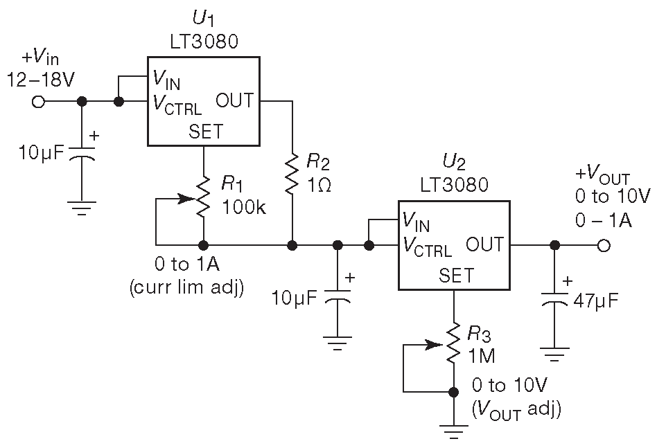 Базовая схема показана на рис. 9.22. В качестве примера взят источник 0...10 V . Архитектура серии LT3080 позволяет очень легко добавить регулируемое ограничение по току, которое тоже имеет нижним пределом ноль, см. рис. 9.23. Предварительный регулятор \(U_1\) превращён в источник тока 0...1A , а два стабилизатора вместе образуют источник напряжения с регулировкой тока ( или, если угодно, источник тока с ограничением по напряжению ).