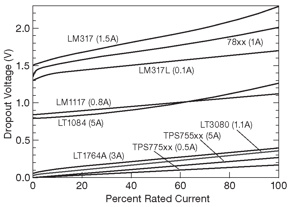 Рис. 9.24 Величина падения напряжения на линейных регуляторах. Два самых нижних графика ( с префиксами «TPS-» ) представляют КМОП микросхемы, все остальные - биполярные. См. также рис. 9.11