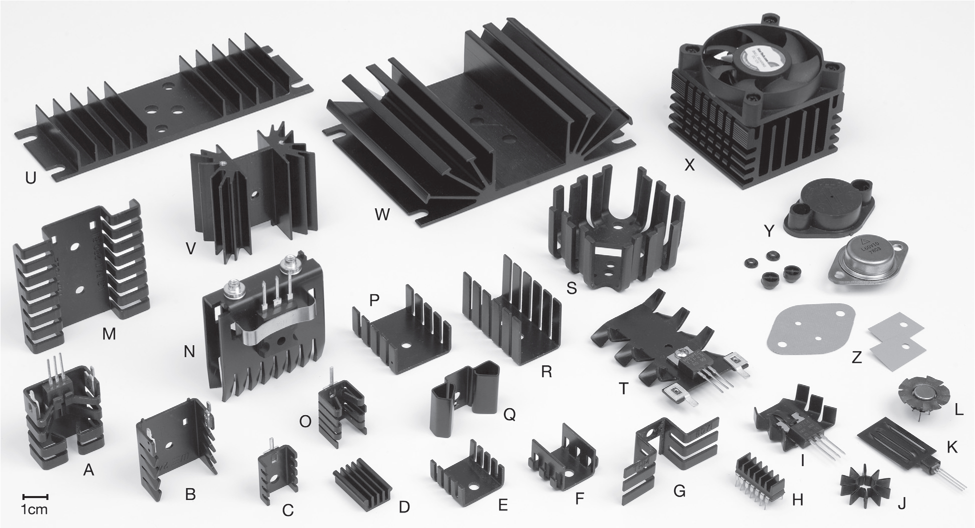 Единственной задачей теплоотвода является поддержание температуры перехода транзистора или иного прибора ниже некоторой максимальной величины. Для кремниевых транзисторов в металлических корпусах данная величина составляет 200°C , а в пластиковых 150°C 33 . Расчёт теплоотвода достаточно прост: если известна максимальная снимаемая с устройства мощность, можно подсчитать температуру перехода, используя данные по отводу тепла через корпус, теплоотвод и т.д. и температуру среды, в которую всё это будет помещено. Далее надо взять достаточно большой радиатор, чтобы удержать температуру перехода в заданных производителем границах. Правильнее будет не экономить на теплоотводе, потому что срок службы полупроводников быстро сокращается при работе вблизи допустимого максимума температуры. На рис. 9.42 показана приличная коллекция всевозможных радиаторов, которые можно встретить внутри мощных устройств.