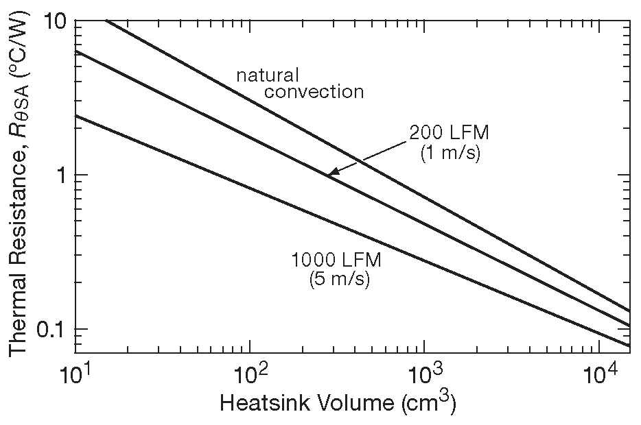 Рис. 9.43 Очень приблизительная прикидка объёма теплоотвода от его термосопротивления радиатор-среда \(R_{\Theta SA}\)
