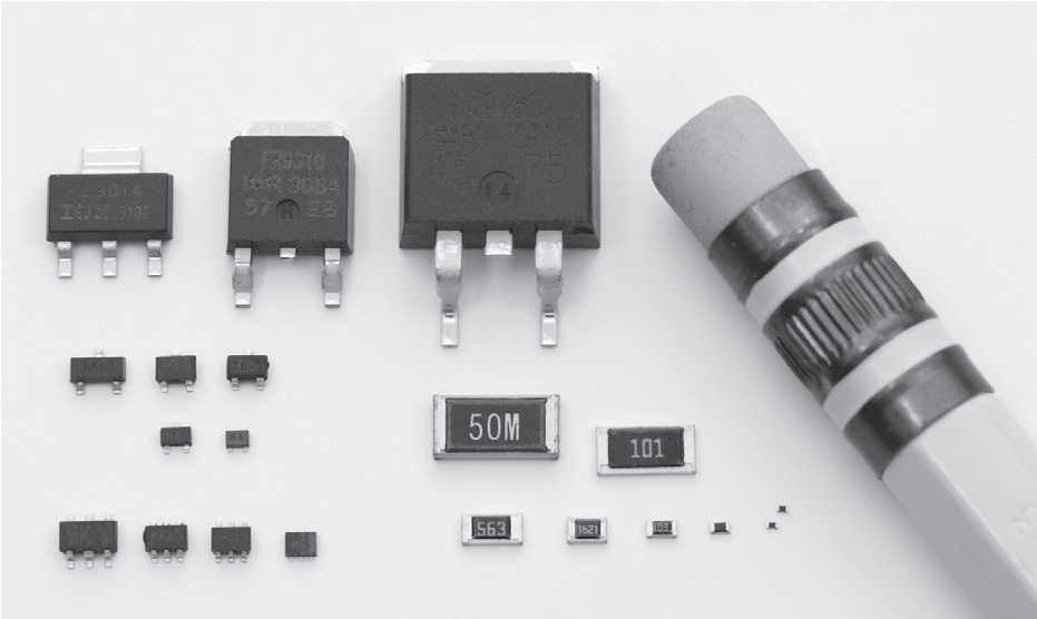 Рис. 9.44 Мощные транзисторы упаковывают в корпуса для поверхностного монтажа, удобные для ручной пайки. Они могут рассеивать несколько ватт через монтажный фланец и выводы, если припаяны к полигону из медной фольги площадью несколько квадратных сантиметров, см. рис. 9.45 . Корпуса из верхнего ряда ( SOT-223, DPAK, DDPAK), смонтированные на полигон площадью 6 cm2 смогут отвести ∼3W . Маленькие корпуса в аналогичных условиях смогут рассеять ∼0.5 W . Для сравнения внизу справа располагаются чип-резисторы размером от 2512 до 0201