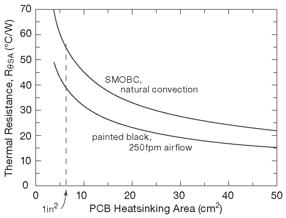 Рис. 9.45 Приближённое значение теплового сопротивления изолированного полигона из фольги. Паяльная маска снижает эффективность теплоотвода, особенно если сравнивать с чистой, принудительно обдуваемой поверхностью меди. ( SMOBC - паяльная маска по меди )