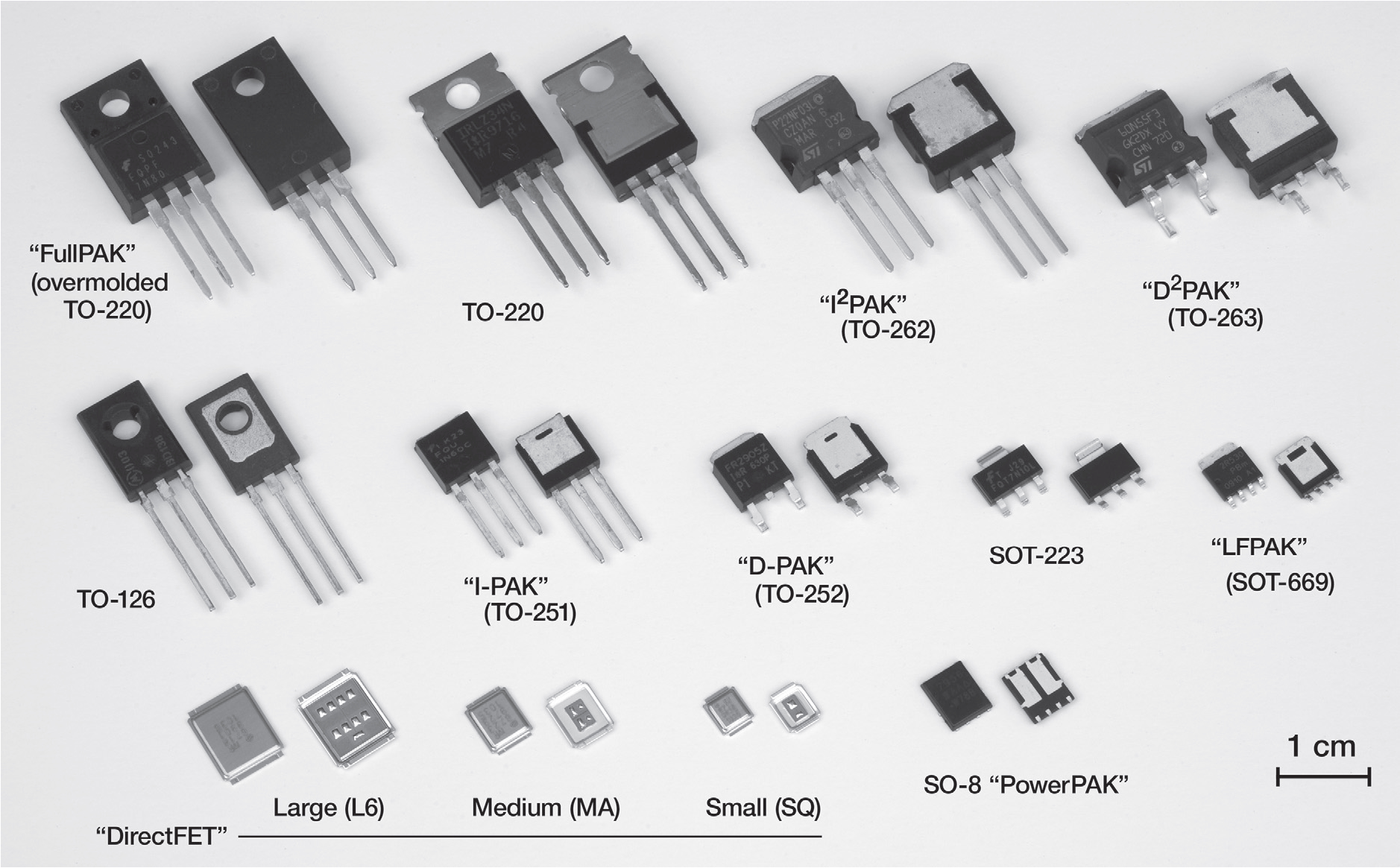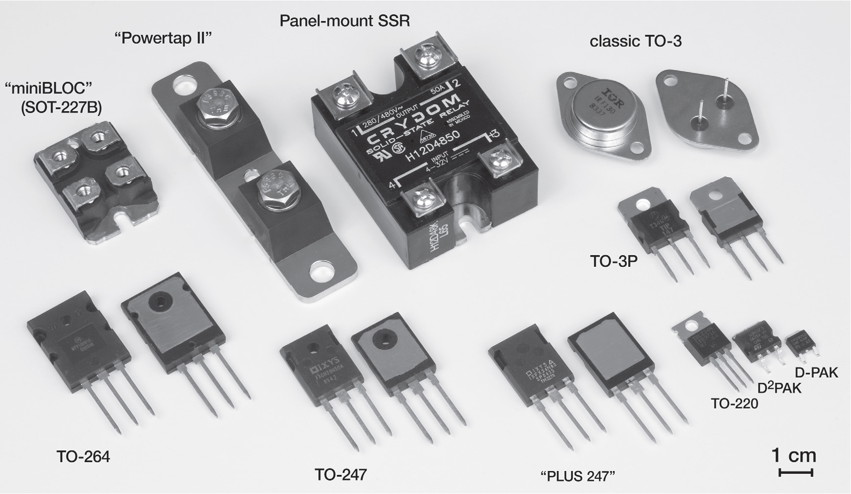 Все мощные устройства упаковывают в корпуса, которые обеспечивают контакт с теплоотводом. На нижнем конце спектра ( до ватта ) устройства могут охлаждаться за счёт отвода тепла через выводы корпуса, припаянные к печатной плате. По мере роста мощности в дело вступают корпуса со всё более массивным фланцами и выводами ( SOT-223, TO-252, TO-263, DPAK, DDPAK), а затем и более эффективные методы корпусирования, подобные технологии «DirectFET» ( см. рис. 9.46 ). Для тепловых потоков, превышающих 5W , корпуса обзаводятся монтажными отверстиями для крепления к радиатору ( TO-3, TO-220, TO-247 ). По-настоящему мощные полупроводниковые приборы производятся в корпусах, не предполагающих установку на печатной плате ( «MiniBLOC», «PowerTap», см. рис. 9.47 ). При хорошем теплоотводе такие конструкции могут рассеивать 100 W и более. Монтажные фланцы и металлические поверхности корпусов мощных полупроводников, исключая полностью изолированные варианты, электрически соединяются с каким-либо из сигнальных выводов ( у биполярных транзисторов это коллектор, а у МОП приборов - сток ).