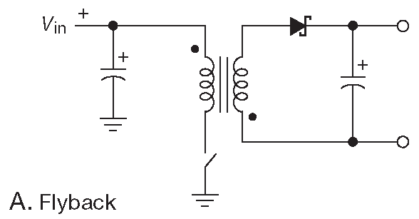 Рис. 9.73 (A) Изолированные ключевые преобразователи. Обратноходовая схема использует накопительную индуктивность с вторичной обмоткой