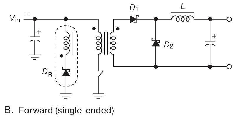 Рис. 9.73 (B) Изолированные ключевые преобразователи. Прямоходовой вариант использует настоящий трансформатор без накопления энергии ( и требует, поэтому, наличия выходной накопительной индуктивности ). Диод \( D_R\) и третья обмотка - один из нескольких путей разряда ( размагничивания ) сердечника в однополярной схеме включения