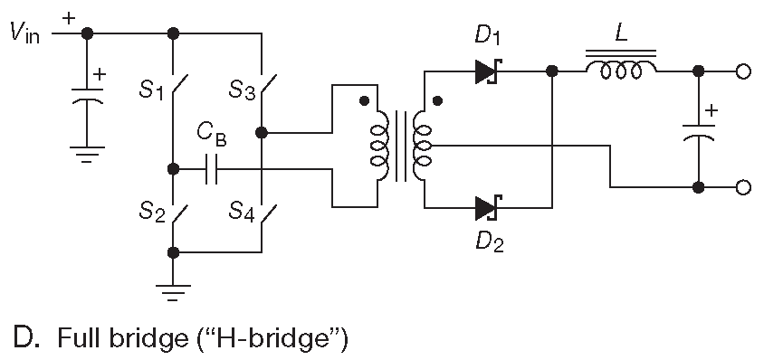 Полумостовые преобразователи используются при больших ( выше 100 W ) мощностях нагрузки, потому что за счёт симметричного изменения магнитного потока в каждом цикле они эффективнее используют магнитных материал сердечника. Кроме того, по сравнению с однополярной прямоходовой схемой они в два раза понижают напряжение на каждом ключе. Ещё одна пара ключей превращает полумост в полный мост , в котором в каждом полуцикле к обмотке прикладывается полное входное напряжение ( ниже приводятся некоторые соображения о балансировке магнитного потока ). Полный мост позволяет использовать иную форму регуляции, называемую «фазовым управлением». Здесь каждая пара ключей работает с 50% скважностью, но фаза рабочего цикла одной пары сдвигается относительно фазы другой пары, позволяя получить рабочий цикл переменной длительности 95 .