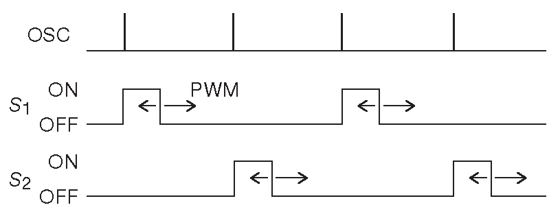 Рис. 9.75 Широтно-импульсная модуляция в полумостовом преобразователе. Внутренний генератор запускает активную часть цикла каждого ключа, а обратная связь отвечает за её окончание отдельно для каждого ключа