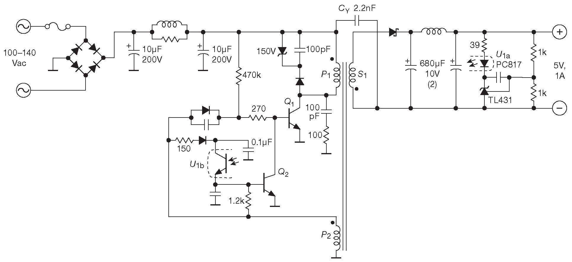 Рис. 9.74 Дешёвый обратноходовой сетевой преобразователь на 5W , который использует автоколебательный «блокинг-генератор». Обмотка P2 обеспечивает положительную обратную связь для поддержания колебаний. Выходное напряжение сравнивается компаратором из параллельного стабилизатора TL431, который подстраивает рабочий цикл, замыкая обратную связь через оптопару \(U_1\)