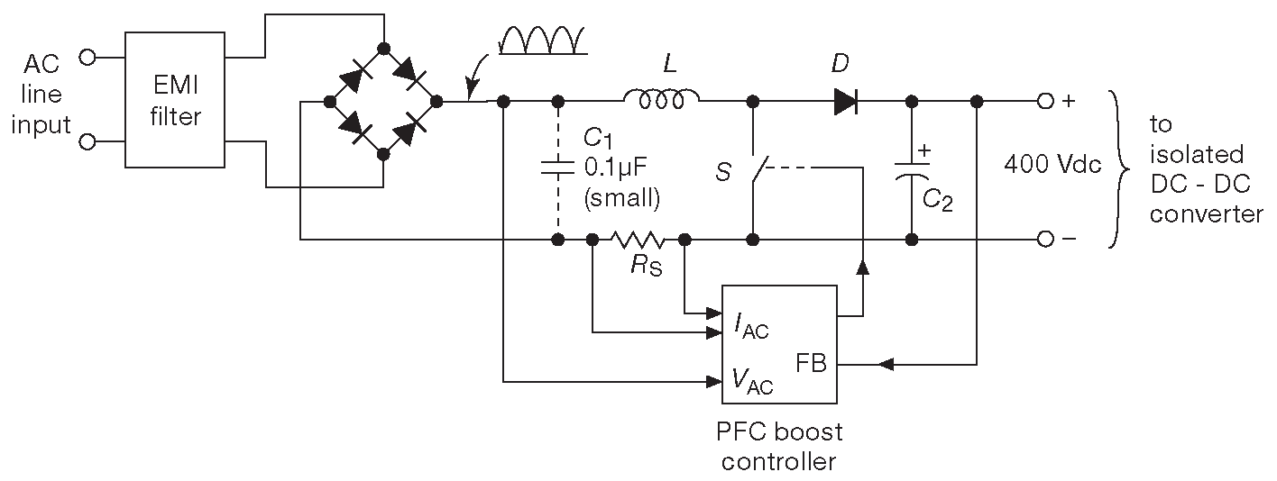 Рис. 9.77 Простой выпрямитель по схеме 9.76 создаёт неприятный токовый импульс, каждые полпериода сетевого напряжения ( низкий коэффициент мощности ). Проблема исправляется входным модулем корректора мощности, состоящим из повышающего преобразователя, работающего от выпрямленного, но неотфильтрованного сетевого напряжения. Управляет процессом специальный PFC контроллер, который поддерживает входной ток на уровне, приблизительно пропорциональном входному напряжению