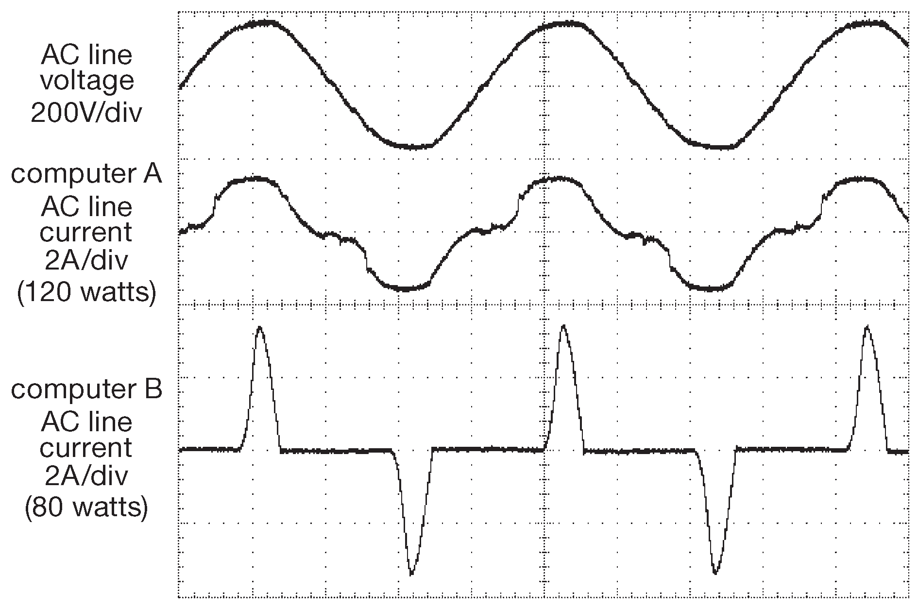 Рис. 9.78 Сказание о двух компьютерах. Компьютер A экипирован блоком питания с коррекцией коэффициента мощности, что ведёт к определённому сходству входного тока с напряжением сети. Блок питания машины B, выпущенной на десять лет раньше, схемы PFC не имеет и, несмотря на аккуратно вытертую пыль, заряжает конденсатор фильтра короткими токовыми импульсами. По горизонтали 4 ms/div