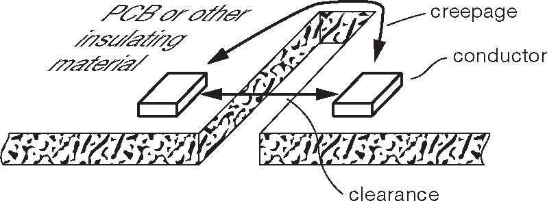 Рис. 9.79 Два пути преодоления изоляционного барьера: быстрый пробой через воздушный зазор ( задаётся величиной зазора ) и утечки по поверхности изолирующего материала ( задаётся величиной дистанции поверхностного пробоя )